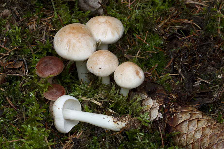 Marasmiellus candidus - Gråfiltet bruskhat Marasmiellus humillimus - Liden bruskhat Marasmiellus ramealis - Gren-bruskhat Marasmiellus tricolor - Trefarvet bruskhat Mara...